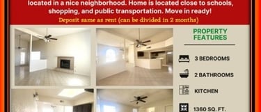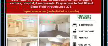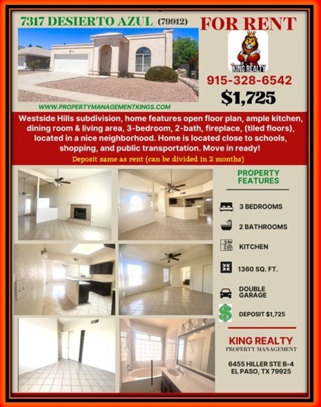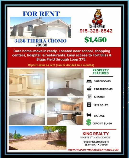 2 bathrooms, apple kitchen, oversize garage. Located near schools, hospital, & restaurants. Easy access to Fort Bliss & Biggs Field through Loop 375. Rent $1,450